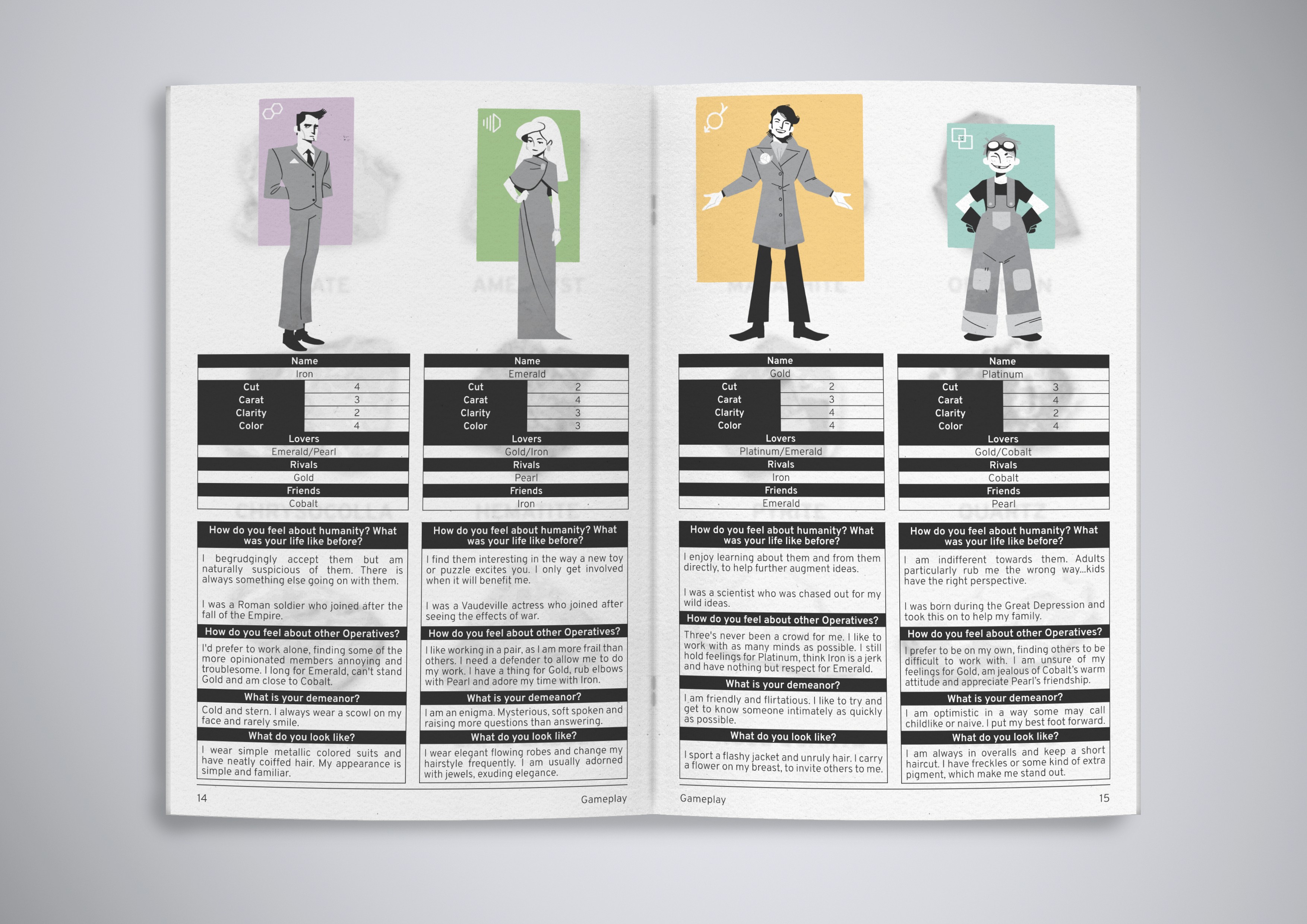 Results: a limited run was risoprinted in six different colourways to represent the six characters presented in the game